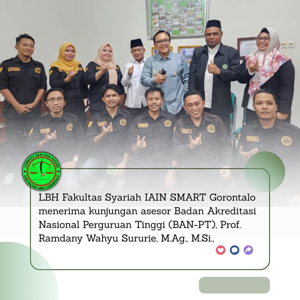 GORONTALO – Lembaga Bantuan Hukum (LBH) Fakultas Syariah IAIN SMART Gorontalo menerima kunjungan asesor Badan Akreditasi Nasional Perguruan Tinggi (BAN-PT), Prof. Ramdany Wahyu Sururie, M.Ag., M.Si., dalam rangka penilaian dan penguatan mutu kelembagaan.